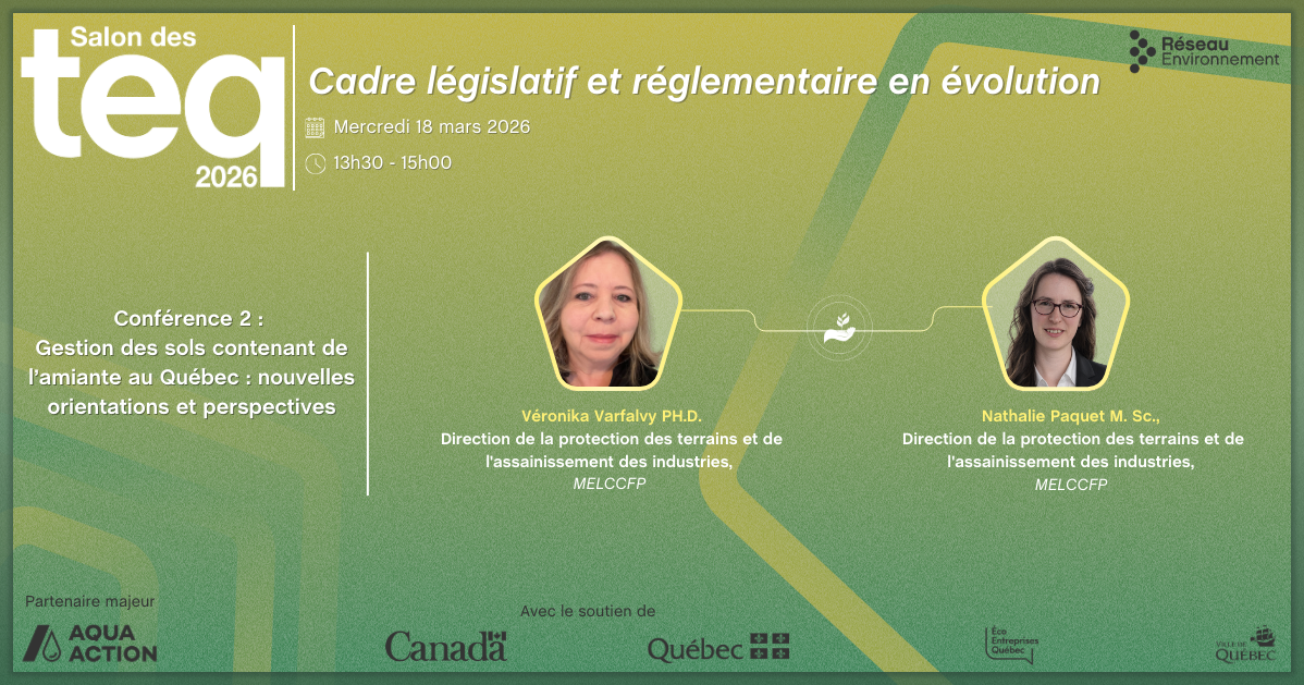 Réseau se prononce sur la valorisation des sols amiantés en fonction du cadre réglementaire en vigueur et des recommandations du MELCCFP et sur l’amélioration des modes de gestion des sols amiantés sur les chantiers à travers 10 recommandations spécifiques. En effet, ce mémoire sur ce contaminant non mobile porte plus précisément sur les conditions et restrictions liées à sa gestion, soit :