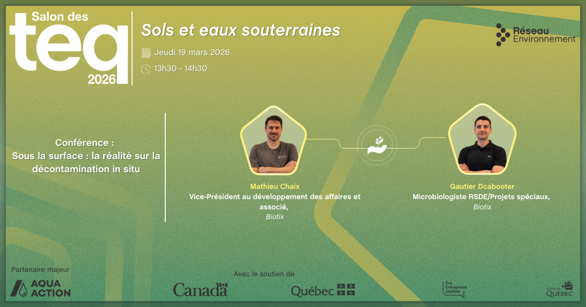 Nous présenterons une nouvelle technologie innovante en réhabilitation in situ complètement développer par une PME Québecoise. Nous expliquerons rapidement le concept de la technologie et les résultats qu'elle permet d'atteindre et nous aborderons un cas de figure réelle où une décontamination in situ a été appliquée. Nous présenterons des informations liées au type de terrain et aux types de contaminants ainsi que les résultats et statistiques obtenus grâce aux technologies développées par Biotix.